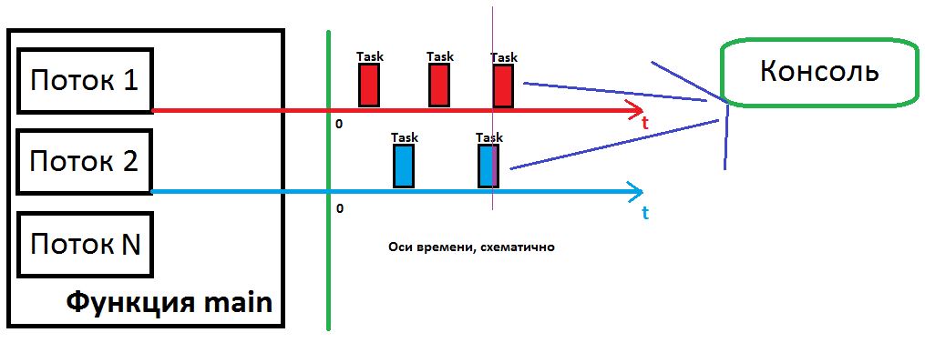 Примечание: в представленной программе происходит «параллельное» обращение к одним и тем же ресурсам – консоли, из-за чего могут возникать «ошибки», объясним это на картинке