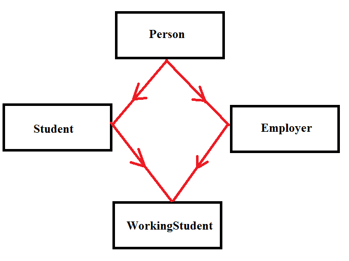Если расписать порядок наследования, то от Person наследуются Student Employer, а от них WorkingStudent, т.е. получается фигура как на картинке (ромб).